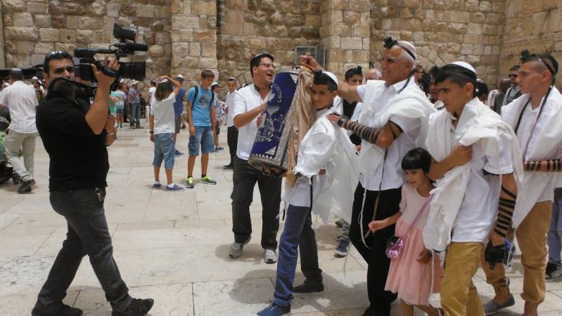 Bij het bereiken van de 13 jarige leeftijd wordt een Joodse jongen een “zoon van het Gebod” een “Bar Mitswa”. Het is vergelijkbaar met ons afleggen van de “Belijdenis van het geloof! Deze viering, die tijdens de Middeleeuwen is ingesteld is een geweldig feest, waarbij de dertienjarige de Thorarollen mag dragen. Het mooie van deze foto is dat het zeer modern is vastgelegd door een techneut die denkt dat hij overal verstand van heeft. Dit gedrag komen we wereldwijd tegen en is niet alleen menselijks, maar ook zo gewoon. Het meisje op de foto is nog geen “Bat Mitswa” en heeft dus de 12 jarige leeftijd nog niet behaald. Deze jongeman heeft nu het recht om aan alle gebieden van het joodse gemeenschapsleven deel te nemen en is hij verantwoordelijk voor het volgen van de mitswot (wetten), tradities en ethiek.