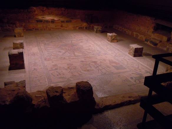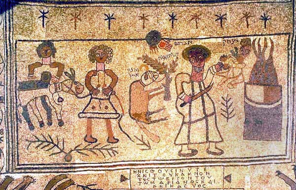 Bij het betreden van de ruimte zien een vloer die verschillende thema’s in een mozaïek uitbeeld. De steentjes hebben de grootte van ongeveer 1 bij 1 centimeter en zijn voornamelijk gesorteerd op kleur. Vooral tijdens de Byzantijnse periode(300 t/m 1400) werden deze vloeren met veel aandacht door kunstenaar gecreëerd. Deze vloer uit de 6e eeuw was eigenlijk gemaakt de vroeg Byzantijnse periode of te wel het Oost Romeinse Rijk. Maar nu de mooie afbeeldingen. Het eerste wat we zien is de bijna offering van Izaäk door Abraham, beschreven in Genesis 22: 1-18. Als je goed naar deze voorstelling kijkt, is de boven in het midden de Hand van God die in gaat grijpen, heel goed zichtbaar. De namen van Abraham (Avram) en Izaäk (Yitschak) worden in deze voorstelling netjes in het Hebreeuws beschreven.