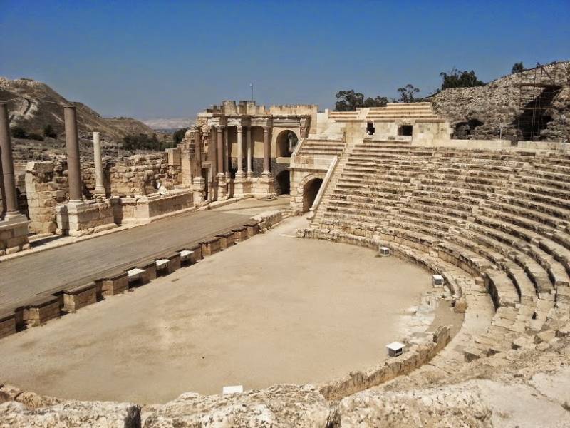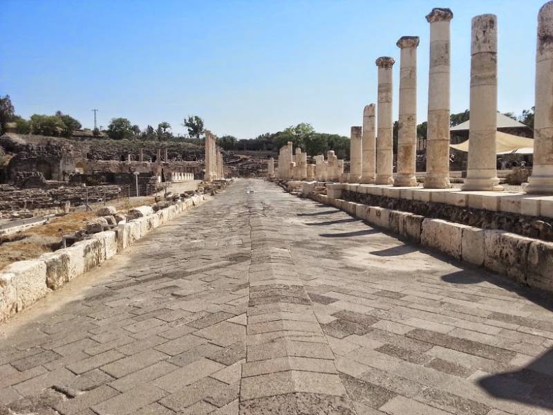We halen er maar deze keer even de komma voor het gemak eruit.Naast het huidige moderne stadje in de Jordaanvallei ten zuiden van het Meer van Tiberias, kent een zeer uitgebreid gebied met opgravingen, dat natuurlijk te bezoeken is! Reeds in de vroege Bronstijd, zo’n 3500 jaar voor Christus was er reeds bewoning. Maar het is al bekend van het tentoonstellen van de wapenuitrusting van de verslagen Koning Shaul, door de Filistijnen (I Sam. 31:10). In die tijd stond er een Filistijnse tempel gewijd aan Ashtoreth. In de 15e eeuw voor Christus was het al een administratief centrum van Farao Thoetmosis III. Toen Jozua het land heroverde werd het reeds vernoemd als een Kanaänitische stad. Ook de Hellenisten konden er wat van en noemden het Scythopolis. In de 2e eeuw voor Christus werd deze Polis weer herover door de Harmoneën en de Makkabeeën. In 64 voor Christus werd het veroverd door de Romeinen die het de naam Decapolis gaf. Gedurende de Byzantijnse periode werd de stad voornamelijk bewoond door Christenen, hoewel er ook Samaritanen, Joden en heidenen in deze stad hun gebedshuis hadden.