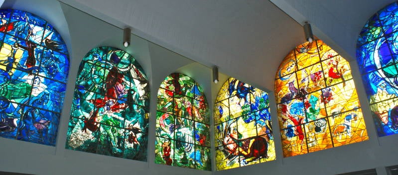 Gedurende het eerste jaar van mijn wonen en werken in Nes Ammim, mocht ik getuige zijn van de bijzonder prachtige ramen van de Synagoge op het terrein van het Chadassa Ziekenhuis in Jeruzalem. Dit ziekenhuis staat op een indrukwekkende locatie. Zeer nabij Yad Vashem en ook op loopafstand van Ein Kerem, het dorp van Johannes de Doper. Maar juist deze 12 ramen die de 12 stammen van Israël uitbeelden hebben mij geïnteresseerd. De Joodse Chagall werd in 1887 in het huidige Wit Rusland geboren en werd Moishe Zakharovich Shagal genoemd. Als artiest verhuisde hij in 1922 naar Frankrijk waar hij veel Joodse, maar ook christelijke kunstwerken maakte van glas en ook op het doek, zoals de kruisiging van Jezus. Hij overleed op 97 jarige leeftijd in Frankrijk